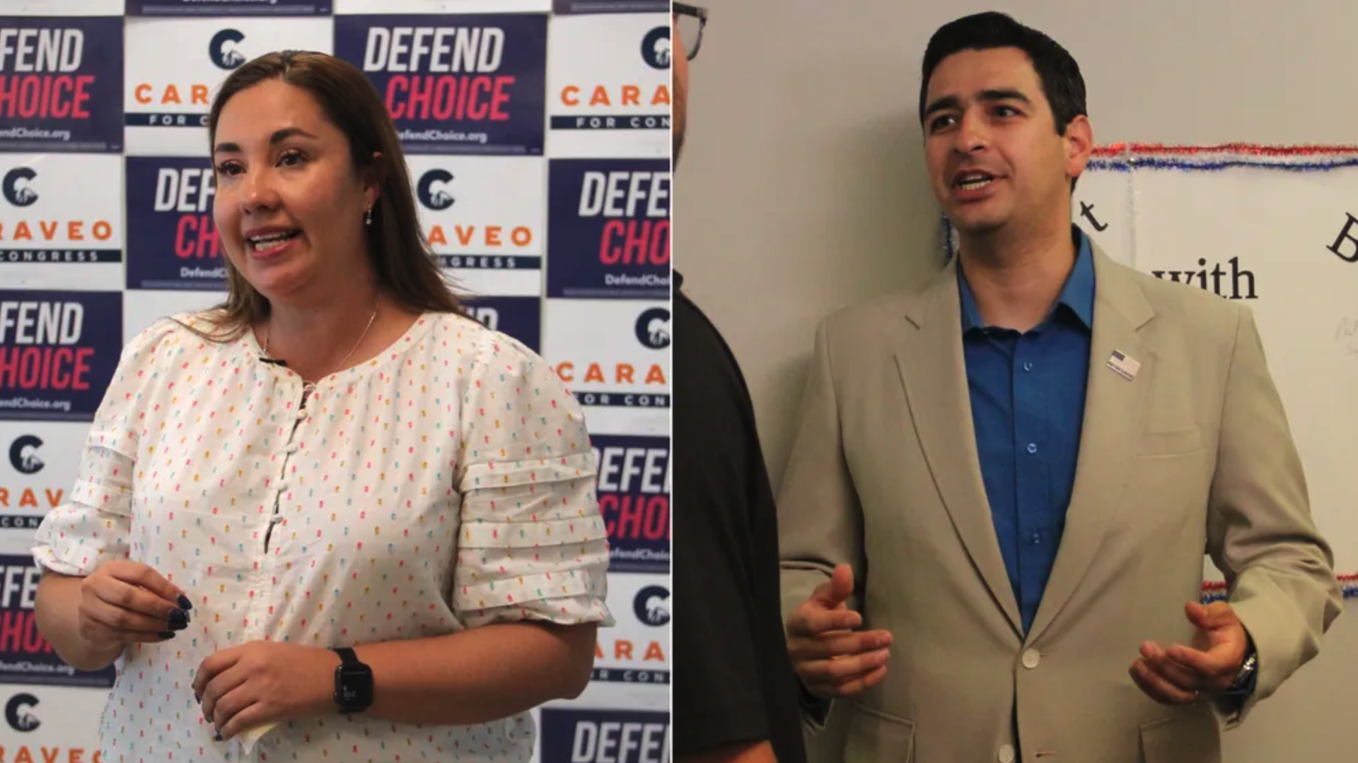 | U.S. Rep. Yadira Caraveo, D-Thornton, and Gabe Evans, a Republican. Photos: Esteban L. Hernandez/Axios |