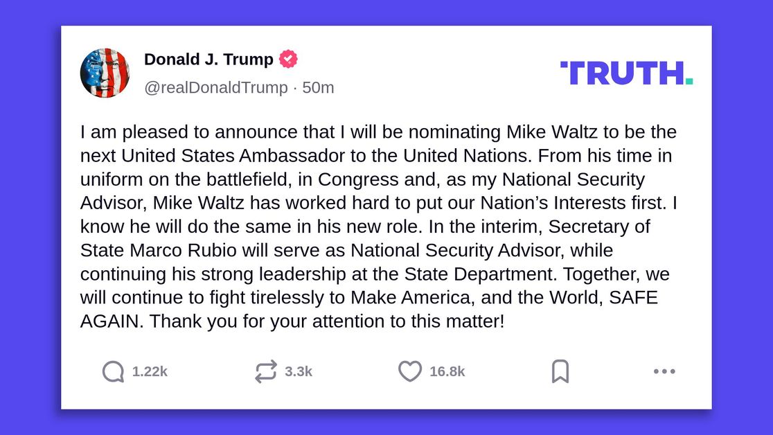 Trump announced Waltz's new gig on Truth Social, saying Waltz had "worked hard to put our Nation's Interests first." - Secretary of State Marco Rubio will serve as interim national security adviser — underscoring his growing importance to Trump.