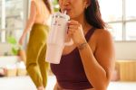Two stanley tumblers in neutral colors held up