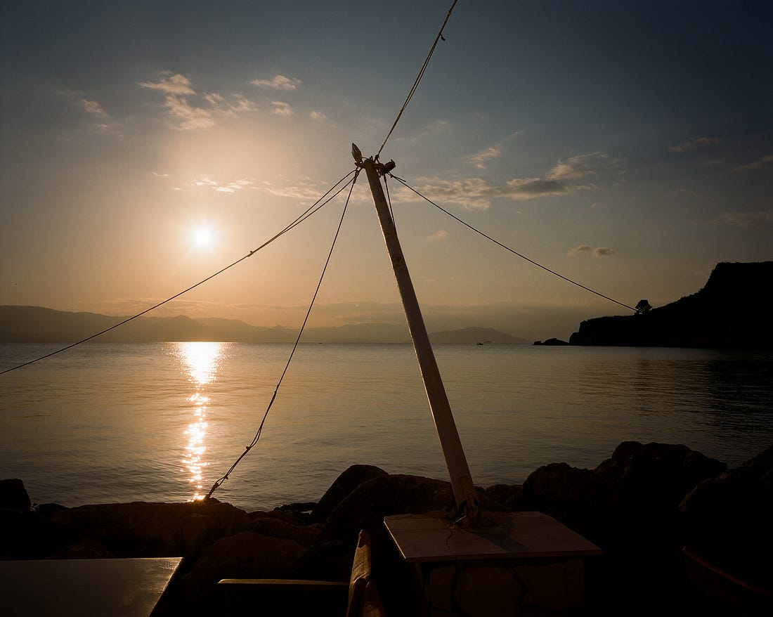 This is a preview of a paid post. To read it in full, consider upgrading. INTERLOPER is a reader-supported publication, and I’m so grateful for all paid subscriptions; they help me continue to work on this project. If you’d like a paid subscription but can’t afford it, reply to this email and I’ll comp you one, no questions asked. Anatomy of an assignmentBehind the scenes in Corfu: creative process, practicalities, & improvisationIn April I went to Corfu, Greece, on one of those commissions that comes around once in a blue moon: one where your own interests and the subject matter perfectly align, with just enough space and novelty to leave something still to be discovered. The assignment was part of The Atlantic’s ‘Literary Travels’ series, for which writers go to destinations that speak to the work of a favourite author or book. I’d be in Corfu with Honor Jones on the tail of John le Carré, who had his own history with the island, and who set a few key scenes in his 1986 novel A Perfect Spy there. The brief was both intriguing and satisfyingly open — and, as such, the assignment was as much a great invitation as it was a puzzle to solve. How to capture the spirit of espionage and alter egos, the stuck-in-the-past Britishisms of Corfu, and a feeling of le Carré’s post-Cold War unease, all in the perfect gorgeousness of spring on a Greek island? I planned to find out. Behind the scenes on assignment workInspired by queen Dina Litovsky’s impeccable assignment reporting (I especially loved her account of photographing one of her heroes, Ringo Starr) I’m going to share a diaristic account of the commission, from top to bottom — creative process, problem-solving, my go-to workflow — and the anecdotes behind it all, the background details that are often the subject I find most interesting as a photographer: the way that a picture shows just a fragment of what it took to make it, and often conceals that making entirely. I’ll get into the fine detail of what happened on this particular assignment in Corfu — practically, personally — and talk through how I built out the photo story, including: