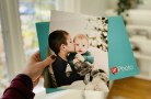 woman holding 8x10 print of 2 children