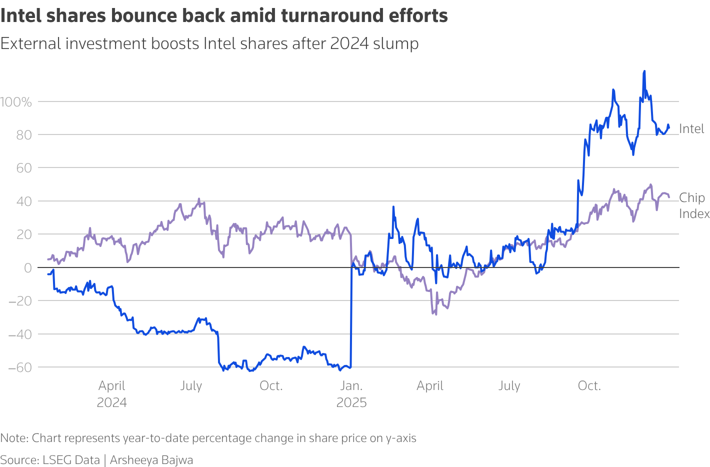 Intel shareholders are more optimistic about the company's results than they have been for many quarters. Investors are betting the turnaround CEO Lip-Bu Tan promised is taking root, both because rapid data center buildouts are fueling demand for its traditional server chips and because the U.S. government took a stake in the chipmaker last year. Intel's stock surged another 12% on Wednesday, ahead of its quarterly earnings report due out later today, bringing its gains for the past 12 months to 152%. |