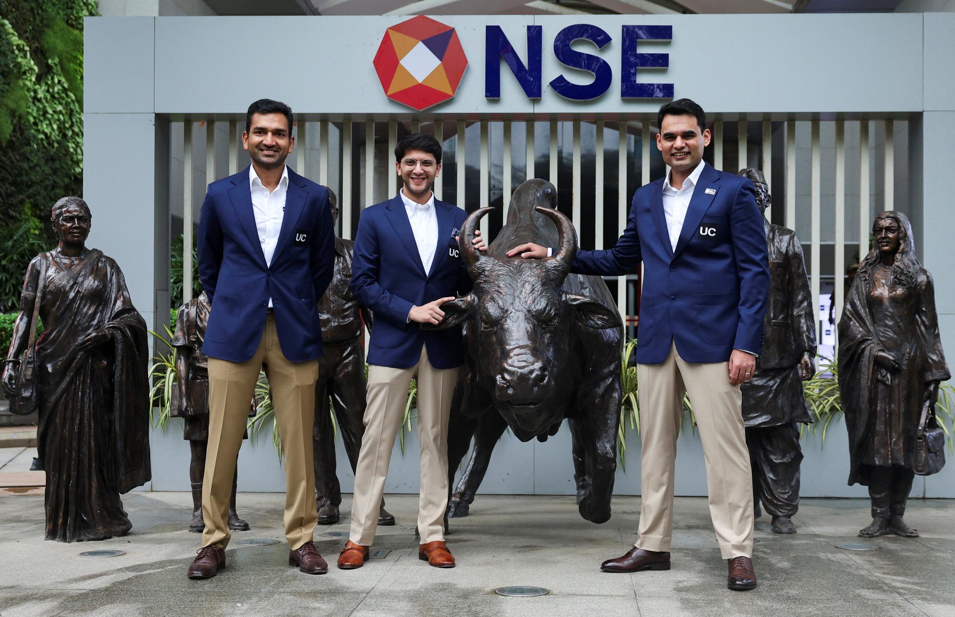 Officials from Urban Company pose with the statue of the NSE bull at the National Stock Exchange (NSE) in Mumbai, India September 17, 2025. REUTERS/Francis Mascarenhas |