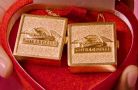 woman holding 2 small candles with bows