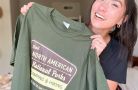 Woman holding a green graphic T-shirt