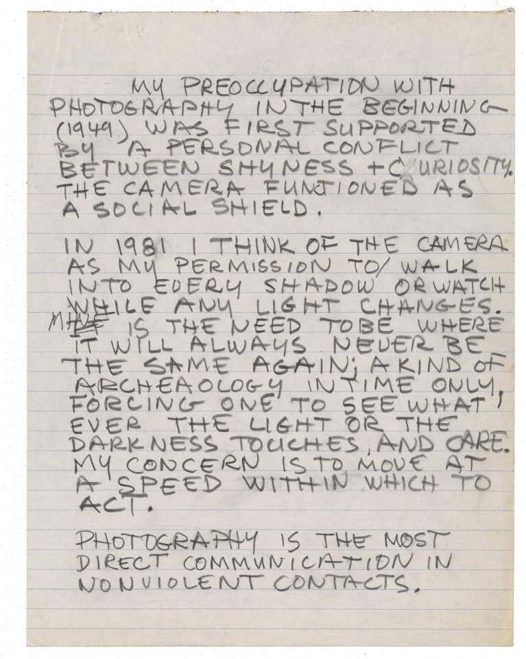 235 ☼ The Camera as a Social Shield: Robert Rauschenberg on Why We PhotographWORKSHOP ANNOUNCEMENT!!Also in this issue: Introducing a new in-person photography workshop, in collaboration with Shane Taylor of Framelines. More info below. Dear friends, A few weeks ago a friend sent me a photo of a handwritten note by artist Robert Rauschenberg. It’s from 1981, written on lined paper in thick pencil, and I loved it. I sat with it and mulled it over in the context of my own practice as a photographer. Most people know Rauschenberg as a painter, sculptor, and he is considered one of the most influential artists of the twentieth century. What you may not realize is that he was also a deeply committed photographer. In this note, he tries to explain why. He writes that his interest in photography began in 1949, and that it was “first supported by a personal conflict between shyness and curiosity.” Oh boy, do I relate to that! He then puts it even more practically by writing: The camera functioned as a social shield. I’ve never seen anyone put it so simply and so honestly! I relate, again! I don’t think most people who know me would describe me as a shy person. I talk to strangers, I host events, I get on stage to do comedy. But there is a version of me, maybe the truest version, that is still quite uncomfortable at parties or in various social settings. But when I have a camera on me, everything changes. I even bring it to parties sometimes when I know I am low on social interaction energy, because I can always feel like myself and have fun when I’m taking pictures. When I’m holding a camera, I have permission to look. To really look, in a way that would be uncomfortable without a camera. I can stand on a street corner and stare at the people walking by, out of curiosity and appreciation, and instead of being a weirdo, I’m a photographer. I can walk into a room full of people I don’t know and start a conversation, because I’m there to document something. The camera turns my curiosity into purpose. It takes the part of you that wants to observe everything and gives it a job title. Rauschenberg understood this in 1949. And by 1981, when he wrote this note, his relationship with the camera had evolved. He writes that he no longer thinks of the camera as a shield but as "my permission to walk into every shadow or watch while any light changes." The defensive concept had become something more open and proactive. Not hiding behind the camera, but using it to move toward things. To me, that shift from shield to permission slip is one of the most important things that can happen in a photographer’s development. And I think most of us go through some version of it. My friend Shane Taylor, who runs Framelines Magazine, and I have talked about this a lot. Over time we've both noticed that so many photographers are introverts. The camera draws in quiet, observant people. But being a solitary person makes it so much harder to push your craft and get feedback. Without that, it’s hard to figure out what your work is actually about. Both of us, independently, started building things to help with that. Shane co-founded Framelines to publish a print magazine, make videos, and started hosting photo walks. I built Process and started doing the same. Now we're teaming up to host our FIRST PHOTOGRAPHY WORKSHOP together in London this May. It's called Voice & Vision, a full day at The Photographer's Gallery focused on helping you figure out what you're trying to say with your photography, and building a concrete plan to go do it. More details below. But back to Rauschenberg's note, because there's another line I keep coming back to. He describes photography as: “a kind of archaeology in time only, forcing one to see whatever the light or the darkness touches, and care.” Archaeology is usually about digging into the past, about uncovering things that have already happened. But Rauschenberg talks about photography as an archaeology of the present, excavating the moment as it happens. In other words: When we take a photo, the moment we documented is already past and gone. This is the tension that makes photography so addictive to me. Every moment is unrepeatable. The light on that building will never look exactly like that again. The expression on that person’s face exists for a moment and then it’s over. When you’re tuned into that it creates an urgency that’s almost physical. I love that feeling. Rauschenberg wrote this note forty-four years ago today. He was describing a practice he’d been engaged in for over thirty years at that point. But when I read it, it feels like it could have been written yesterday by any one of us trying to figure out why we keep picking up a camera. It goes to show that the fundamental questions of photography don’t change. The platforms and the conversation and the gear all change. But the question of why you make pictures, what you’re looking for, what you’re hiding from, what you’re trying to say? All of those stay the same. If you’re someone who started taking photos because you were curious about the world but unsure how to engage with it, you’re in good company. Welcome to the club. Rauschenberg was right there with us, trying to explain it to himself on a sheet of lined paper. The camera is a social shield. And then it becomes a permission slip. And then, if you stick with it long enough, it becomes something else entirely. It becomes a way of caring about and understanding the world. That’s what our workshop is about, and Shane and I are so excited to welcome you to it in May. Scroll down for more info. If this letter did something for you, I’d really appreciate it if you shared it with a friend. ❤️ See you next week! Possibly some preview images of a portrait shoot I have this week with someone whose work I admire very much. Talk soon, Wesley NEW: Voice & Vision Workshop with Shane Taylor, London, May 23 & 24Shane of Framel