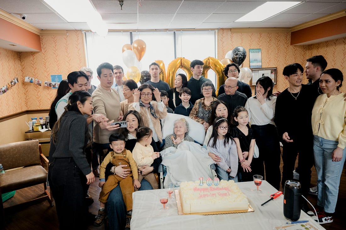 Would you like to show something of yours on FlakPhoto? I’m always looking and love seeing new work. Please email me anytime. Cheers! Years ago, I published a photoblog. Remember those? The premise was simple: a photo a day with some links to see more of that artist’s work. Instagram changed everything, so I’m trying something new: the Monday Muse, a visual inspiration for your email inbox. No algorithms, no ads. Just a picture to start your week. Would you like to show something of yours here? Please email anytime! —AA My Dad’s been in and out of the hospital a lot lately, so I’ve been reading about death, aging, and dying in recent weeks. I know it sounds dark, but I’ve been finding it helpful to focus on the passage of time and what it means to embrace the finitude and quality of our lives. I read Atul Gawande’s Being Mortal, and I finished Donald Hall’s Essays After Eighty the other day, and I highly recommend them both. It helps to think about what our lives might look like years from now — easier said than done, I know. Amid all of this, I came across a wonderful picture by photographer Hannah Yoon, who has become a favorite blogger of mine over the past year. She made this image earlier this month for her grandmother’s 100th birthday. On the surface, it’s a family snapshot celebrating this important event, but when you slow down and look closely, it’s a rich tapestry of colorful characters, with multiple stories unfolding within the frame. Hannah’s picture is about people and relationships, and, above all, the connections among family members. In her latest post, she writes about community and the Korean concept of Jeong: Jeong (정) represents deep, unspoken emotional bonds, collective warmth, and long-term attachment developed over time between people, places, or objects. Jeong is commonly experienced through sharing, mutual care, and selfless actions. Jeong de-centers each person and focuses on the collective experience. These days — especially now, with so much terrible stuff happening around the world — each of us can use more Jeong in our lives. The bonds of close friends and family are good for our minds, bodies, and overall health. These relationships nurture our spirits, and we shouldn’t take them for granted. It’s obvious stuff, but easy to forget. I hope you’ll read Hannah’s post this week and check out her newsletter, Notes from Hannah Yoon. You can learn more about her on her website and follow her on Instagram — she shows photography there @hannahloveyoon. Thanks again for sharing your work with me, Hannah! Take care of yourselves this week, friends, and be well. Cheers! Do you want to contribute photography or writing to FlakPhoto? Please feel free to email anytime. I’m always looking and love seeing new work. Cheers! |