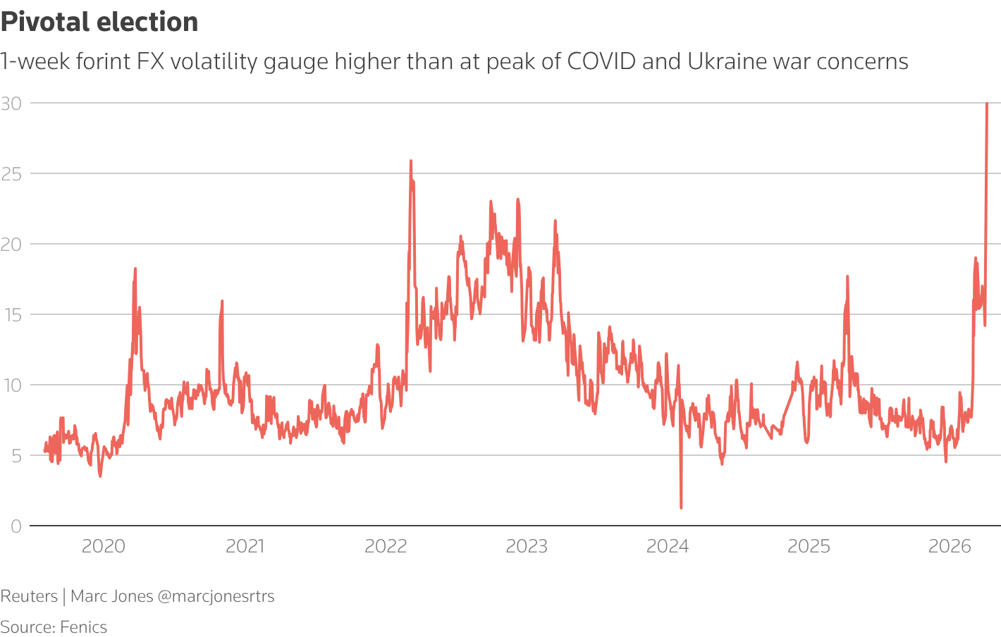 Most polls show political newcomer Peter Magyar, who has built an opposition from scratch in just two years, well ahead, possibly on course for a two-thirds majority, and Polymarket puts his chances of victory at about 70%.